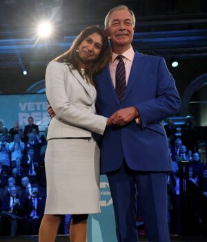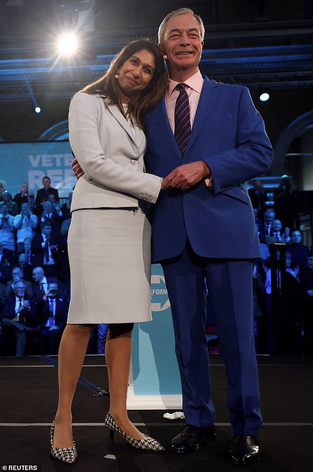Farage, em um terno azul ofuscante que poderia ter sido roubado do ícone da moda Lib Dem, Josh Barind, estava sentado em uma mesa baixa à sua esquerda. Quando ouviu a prolixa lealdade de seu novo recruta, Braverman – “a única pessoa em quem confiava” – ele balançou a cabeça ao pensar em suas notáveis qualificações.