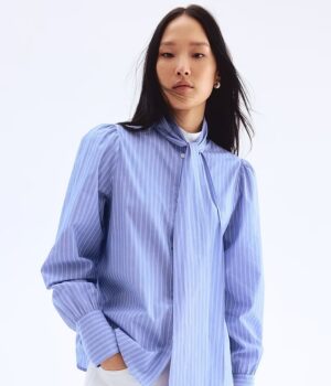 Aliás, a COS é uma loja de rua que tem alguns ótimos exemplos de camisas de cachecol, além de outras marcas, como outras histórias e H&M. Se você acha que esses lenços dramáticos estão um pouco assustados, há uma versão altamente acessível com um lenço curto da M&S; Ficará ótimo com um par de calças Navie Hi Waist.