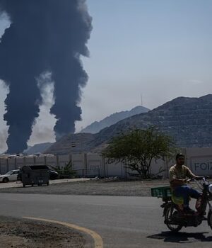 Um homem anda de bicicleta em Fujairah, Emirados Árabes Unidos, sábado, 14 de março, depois que destroços de um drone iraniano interceptado atingiram uma instalação petrolífera, enviando uma nuvem de fogo e fumaça, segundo as autoridades.