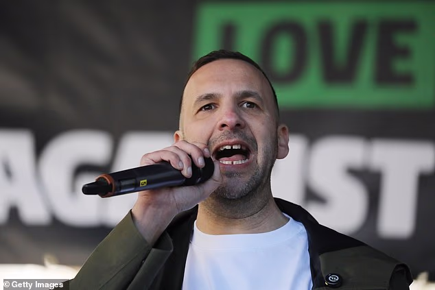 O líder do Partido Verde, Jack Polanski, discursando no comício 'Juntos Contra a Extrema Direita' no sábado, 28 de março