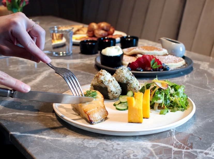 Tetra Hotel Adventia Lobster Tail, Porqueta e Misso Hollandis estão servindo ramo tradicional queridos e com alimentos abertos e abertos, incluindo ovos de surf e relva; Catsu de frango; E uma placa Washoku, um prato de ramificação tradicional no Japão.