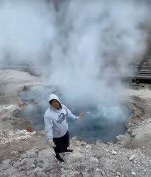 O artista musical Doboi 909 parece ter ignorado uma lei federal que proíbe caminhar em características térmicas no Parque Nacional de Yellowstone em Wiming. Ele postou um vídeo em seu canal no YouTube em 4 de maio, mostra que ele fica à beira da fonte termal fumegante