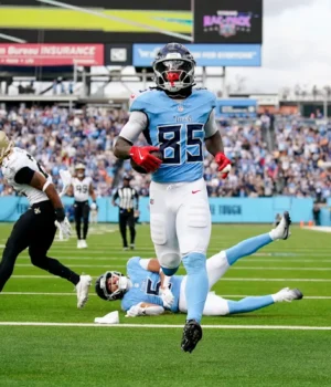 O tight end do Tennessee Titans, Chig Okonkwo (85), corre para um touchdown contra o New Orleans Saints no segundo quarto no Nissan Stadium, domingo, 28 de dezembro de 2025, em Nashville, Tennessee.