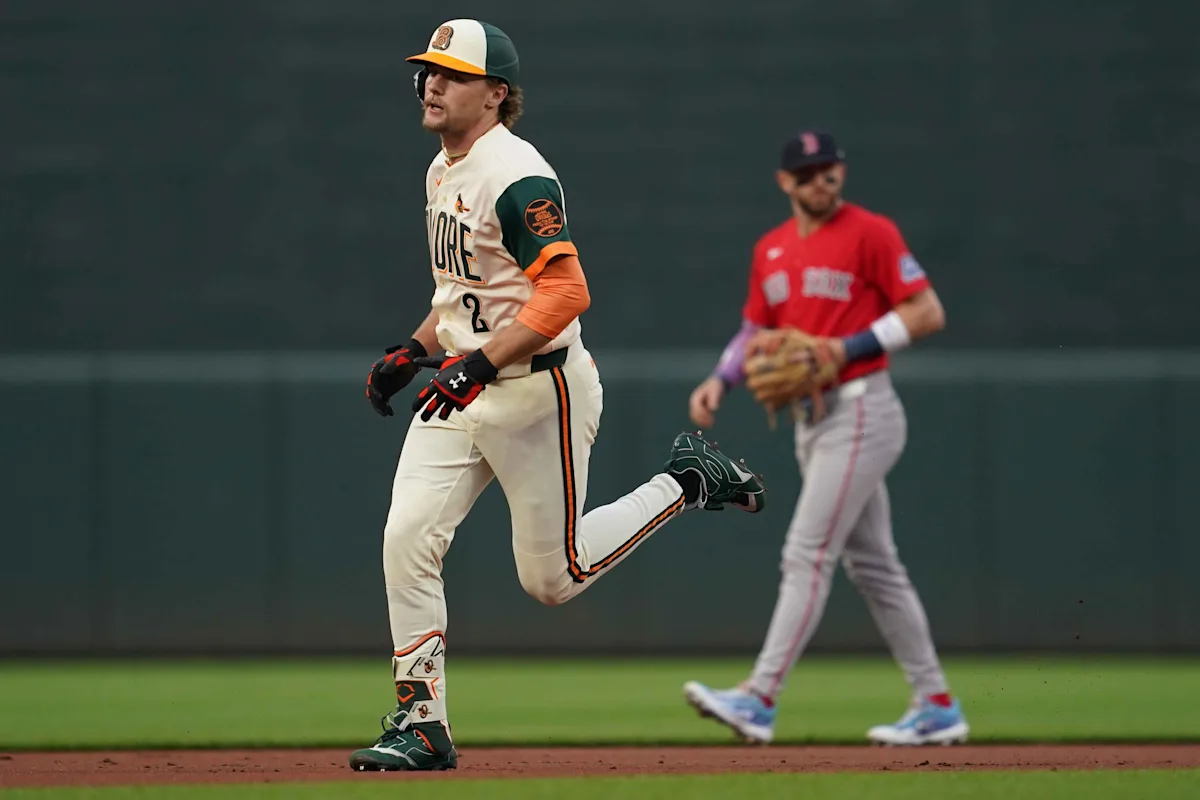 24 de abril de 2026; Baltimore, Maryland, EUA; O shortstop do Baltimore Orioles, Gunnar Henderson (2), contorna as bases após seu home run solo durante o primeiro turno contra o Boston Red Sox no Oriole Park em Camden Yards. Crédito obrigatório: Mitch Stringer-Imagn Images | Imagem de Mitch Stringer-Imagon