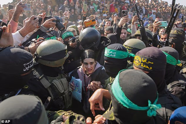Arbel Yehud é auxiliado por combatentes do Hamas e da Jihad Islâmica ao ser entregue à Cruz Vermelha em Khan Yunis, sul da Faixa de Gaza, em 30 de janeiro de 2025.