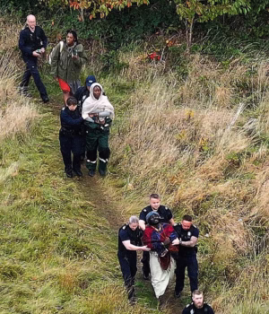 As fotografias mostram que Offhill e Taylor (25) estão afastando os oficiais da floresta das algemas, a mochila Gasho está atrás das costas das costas.