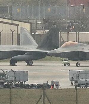 F-22 da Força Aérea dos EUA no Reino Unido, a caminho do Oriente Médio para apoiar bombardeiros B-2, retratados hoje na RAF Lakenheath