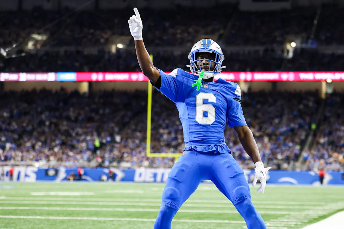 O cornerback do Detroit Lions, Terrion Arnold (6), reage a um bloqueio contra o Minnesota Vikings no domingo, 2 de novembro de 2025, no Ford Field, em Detroit.