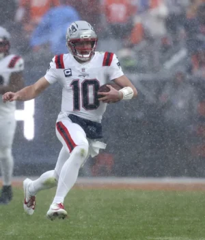 Quando Hollins saiu reserva lesionada Depois de receber dois passes para 51 jardas, o recorde do time, no Empower Field, seu quarterback deixou a vitória por 10-7 com uma lesão no ombro direito. Maye foi demitido 15 vezes desde o início dos playoffs e foi responsável por 86 jardas de passe, 65 jardas de corrida e o único touchdown do New England em sua última partida.