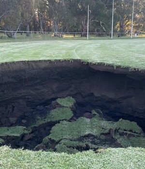 O buraco, de vários metros de largura, foi descoberto em 6 de janeiro no meio do AJ Burkitt Oval de Heidelberg, onde máquinas de perfuração de túneis estão cavando o projeto North East Link, de US$ 26 bilhões.