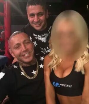 Kaz Hamad (centro) com o ex-motociclista Toby Mitchell e uma garota do ringue de boxe