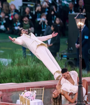 Bad Bunny e muitas outras celebridades dançam em um set de ‘Casita’ no Super Bowl, flanqueados por pessoas em fantasias de grama.