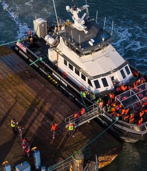 Migrantes desembarcam de barcos da Força de Fronteira no porto de Ramsgate, em Kent, esta semana