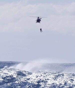 Em minutos, uma equipe dos Serviços de Helicóptero de Resgate Westpack estava no ar, que deveria nadar no empréstimo.