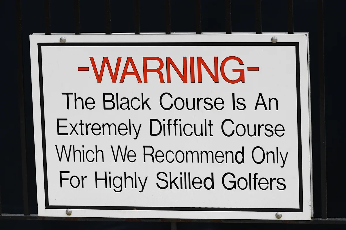 “Aviso”, o sinal começa na grande carta vermelha, “Curso Black é um curso muito difícil que recomendamos apenas para jogador de golfe altamente qualificado”.