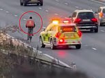Este momento bizarro foi quando um ciclista de distribuição de alimentos avistou pedalar ao longo da M4 no meio da multidão.