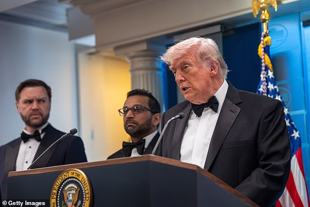 O presidente, de gala, se dirige aos repórteres após o tiroteio na noite de sábado