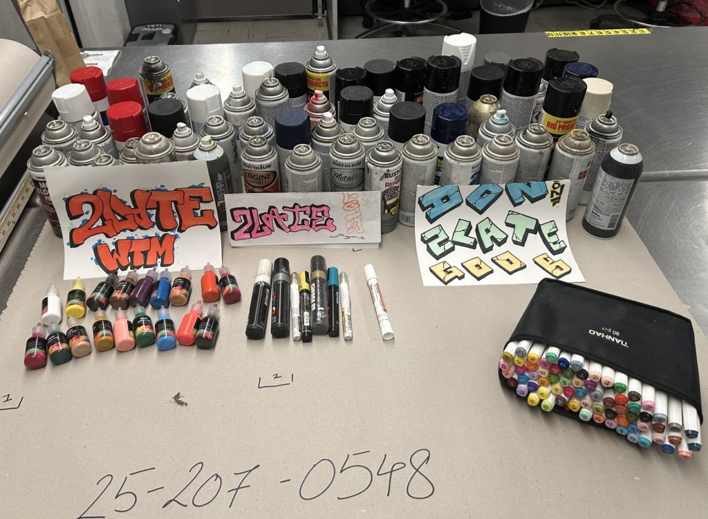 As autoridades disseram que “2late” foi preso em San Jose e os policiais receberam equipamentos de graffiti e tinta spray em sua residência, disseram as autoridades.