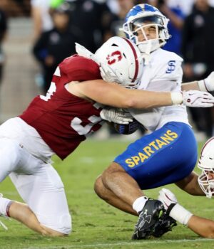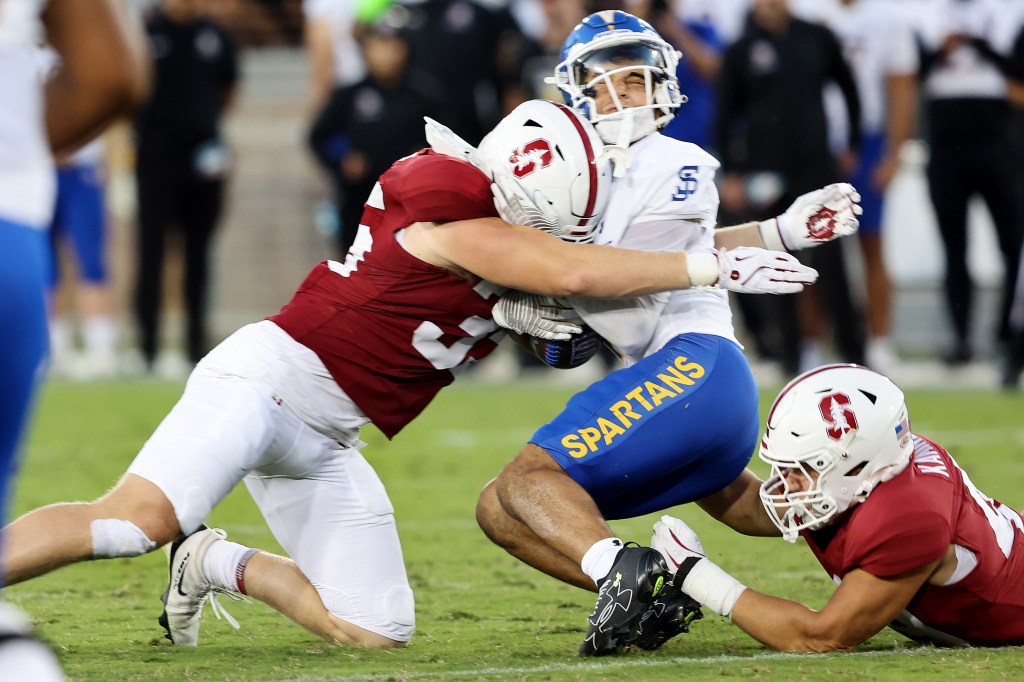 Os espartanos do estado de San Jose, Jackson Kanan (1), a defesa do cardeal de Stanford foi lançada na segunda metade de um jogo de futebol universitário no Stanford Stadium, na Califórnia, sábado, 2 de setembro de 2021. (Ray Chavez/Bay Area News Group).