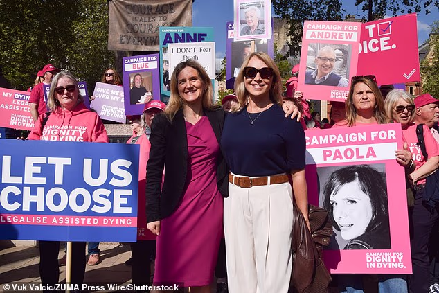 A deputada trabalhista Kim Leadbeater e a ativista Sophie Blake juntaram-se aos apoiadores do Projeto de Lei da Morte Assistida do grupo Dignidade na Morte na Praça do Parlamento para aprovar o projeto na Câmara dos Lordes.