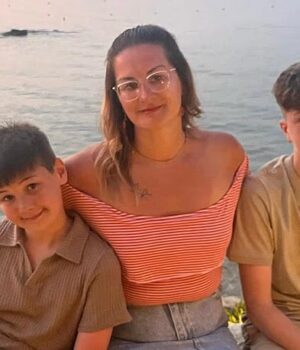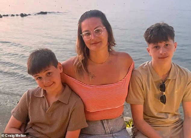 Coleen Mellor fotografada com seus dois filhos Noah e Charlie