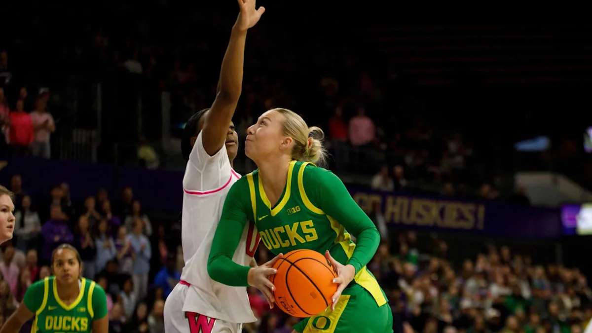 O jogo de três pontos de Mia Jacobs encerrou uma sequência de 15-0 para o Oregon e os Ducks lideraram por 28-27 no intervalo. Washington não conseguiu marcar depois que Elle Ladin acertou um salto para dar aos Huskies uma vantagem de 14 pontos faltando 8:29 para o final do quarto.