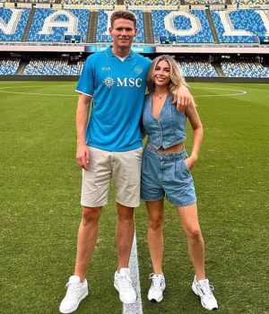 O meio-campista da Escócia e do Napoli, Scott McTominay, está noivo de Cameron Reading – os dois fotografados juntos no Estádio Diego Armando Maradona, de seu clube da Série A