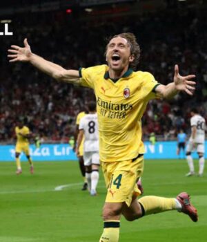 MILAN, Itália – 7 de setembro: Luca Modric Itália, do AC Milan, celebra o primeiro gol de sua equipe durante a partida entre o AC Milan no Maya Stadium em 7 de setembro de 2021 em Milão, na Itália. (Foto de Marco Luzani/Getty Fig.)