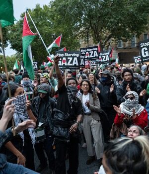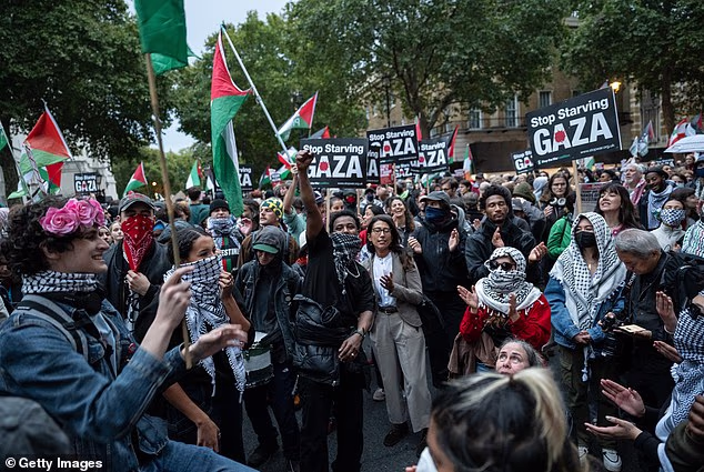 Como parte do protesto contra a prisão de membros da flotilha global de Sumud, várias centenas de trabalhadores se reuniram do lado de fora do portão de Downing Street em Westminster ontem, incluindo Greta Thunberg.
