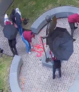 A polícia alegou que o grupo ativista vandalizou a estátua com tinta spray vermelha e usou guarda-chuvas para bloquear as câmeras CCTV e evitar a detecção.