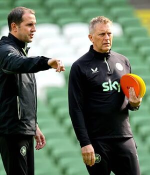 O técnico da Irlanda, Heimir Hallgrimson, com o assistente John O’Shea. Hallgrimson expressou a sua opinião de que Israel não deveria ser autorizado a participar na Liga das Nações da UEFA, mas acredita que a Irlanda deveria preencher o jogo.