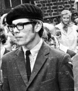 Uma fotografia do líder do Sinn Féin, Gerry Adams, participando de um comício republicano no oeste de Belfast em 1971