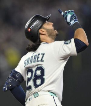 Voltando para o segundo turno, Suarez jogou uma bola rápida de alta velocidade de 95 mph do titular do Toronto, Kevin Gausman, passando pelo bullpen de Seattle para o campo centro-esquerdo, com um eliminado no segundo turno. Suarez olhou para o teto fechado enquanto cruzava o home plate para seu segundo home run nos playoffs. Os Mariners lideram por 1 a 0.