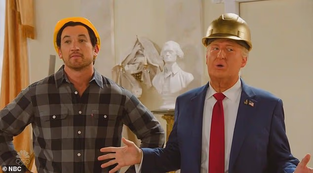 O Saturday Night Live transformou a Casa Branca em uma zona de construção neste fim de semana, enquanto o apresentador Miles Teller, à esquerda, trabalhava com o presidente de James Austin Johnson, Donald Trump, à direita.