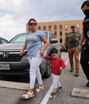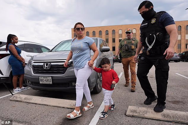 A administração Trump está adiando as audiências de imigração para crianças sob custódia federal em semanas e até meses para acelerar possíveis deportações (Foto: Uma mulher e seu filho são escoltados por agentes federais após serem detidos em frente a um tribunal de imigração em 10 de junho de 2025)