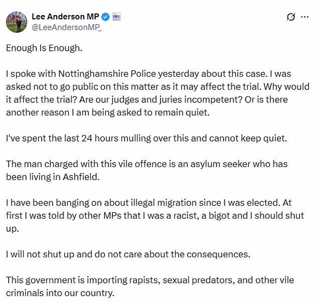 Um requerente de asilo desmascarado foi condenado por estuprar uma menina ‘protegida’ em um parque pelo parlamentar reformista Lee Anderson.
