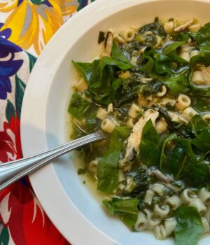 Depois de experimentar todos os remédios contra gripe vendidos sem receita para meu marido, encontrei uma receita que parecia ser o remédio perfeito para a gripe: sopa de macarrão com gengibre e verduras, de Alison Roman, autora do livro de receitas “Something from Nothing”. Ajudou; ele é bom