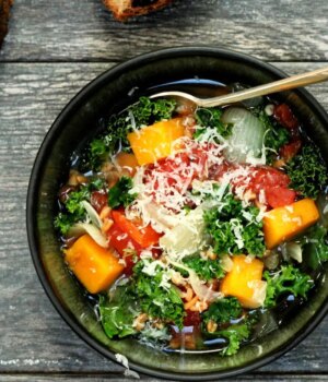 Nesta receita, a doçura e a abóbora equilibram a acidez dos tomates no caldo. Farros grãos de farro são adicionados para uma infusão vegetariana de proteína e textura, e folhas de couve ricas em nutrientes são obedientemente murchas e amolecidas, misturadas no caldo quente.