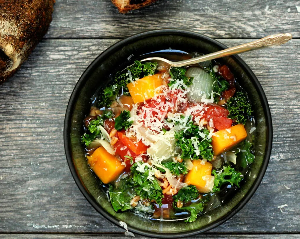 Sopa de farro, couve e abóbora