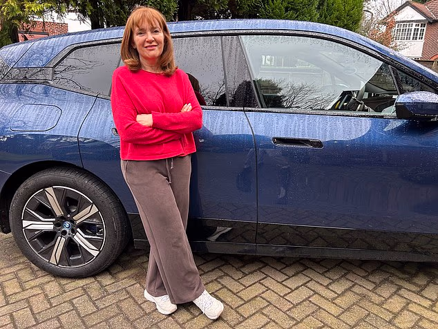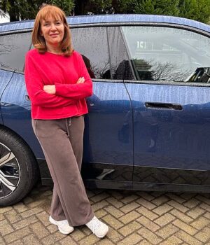 Angela Epstein com o BMW iX40 elétrico do marido, que a deixa enjoada