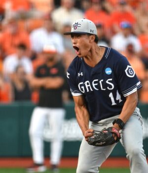 O defensor de St. Mary, Brian Durof (42), o defensor de Saint Mary Diego Casellanos (5), o jogador de campo Ryan Pears (à esquerda) e o jogador de campo Ad Madrigal (1) celebraram sua casa de três corridas contra o estado de Oregon contra sua casa de três corridas.