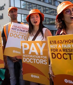 Os médicos juniores participantes ficarão ausentes por seis dias, de 7 a 13 de abril – logo após o fim de semana do feriado da Páscoa – para buscar um aumento salarial de 26%. Foto: Médicos residentes protestam durante uma greve de cinco dias em frente ao Hospital St Thomas em julho de 2025