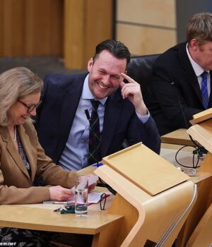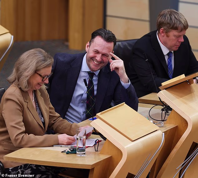 O líder conservador Russell Findlay desfruta de um momento leve durante as perguntas do primeiro ministro
