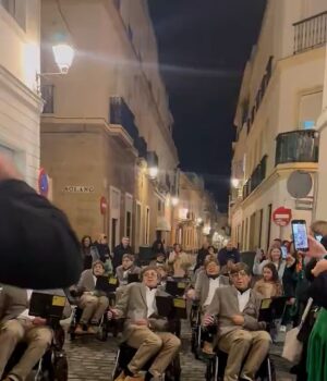 Um grupo de 12 homens em cadeiras de rodas foi visto percorrendo as ruas lamacentas de Cádiz, cantando “Que lindo, Cádiz é lindo” enquanto os espectadores filmavam a procissão esta semana.