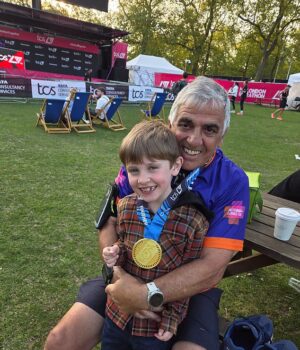 Steve, junto com seu neto Riggs, após terminar a Maratona de Londres no ano passado – apesar de ter sido diagnosticado com Doença Pulmonar Obstrutiva Crônica (DPOC).