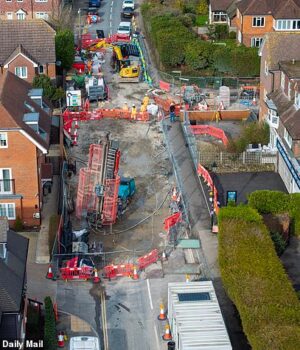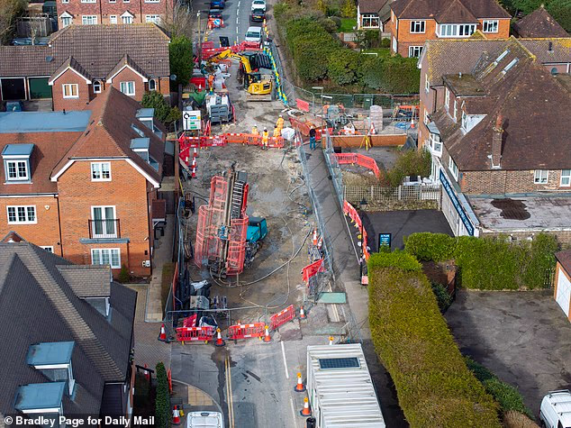 O Conselho do Condado de Surrey disse em um comunicado: ‘Os oficiais rodoviários continuam a lidar com um grande colapso de uma estrada que ocorreu durante a noite na Godstone High Street, Surrey, em 17 de fevereiro de 2025.’