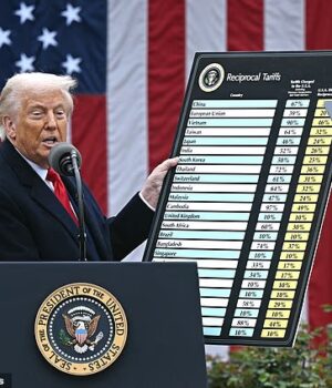O presidente Donald Trump mostra sua lista de tarifas retaliatórias impostas em 2 de abril, ‘Dia da Libertação’