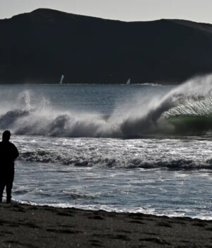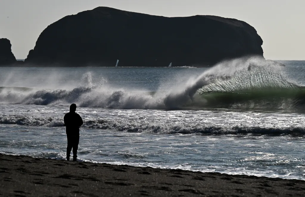 Um pescador observa as ondas quebrando em Rodeo Beach, em Marin Headlands, na segunda-feira, 1º de dezembro de 2025. (Alan Depp/Marine Independent Journal)