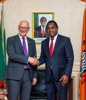 O primeiro-ministro escocês, John Sweeney, encontra-se com o presidente Hakainde Hichilema durante a sua visita à Zâmbia