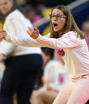 Michigan homenageia Naz Hillmon, a primeira mulher a receber a escola AP toda a América Homenagem em 2022, hasteando uma faixa com seu nome e número (00) até as vigas. O atacante do Atlanta Dream foi nomeado para a WNBA Sexto Jogador do Ano Setembro passado.